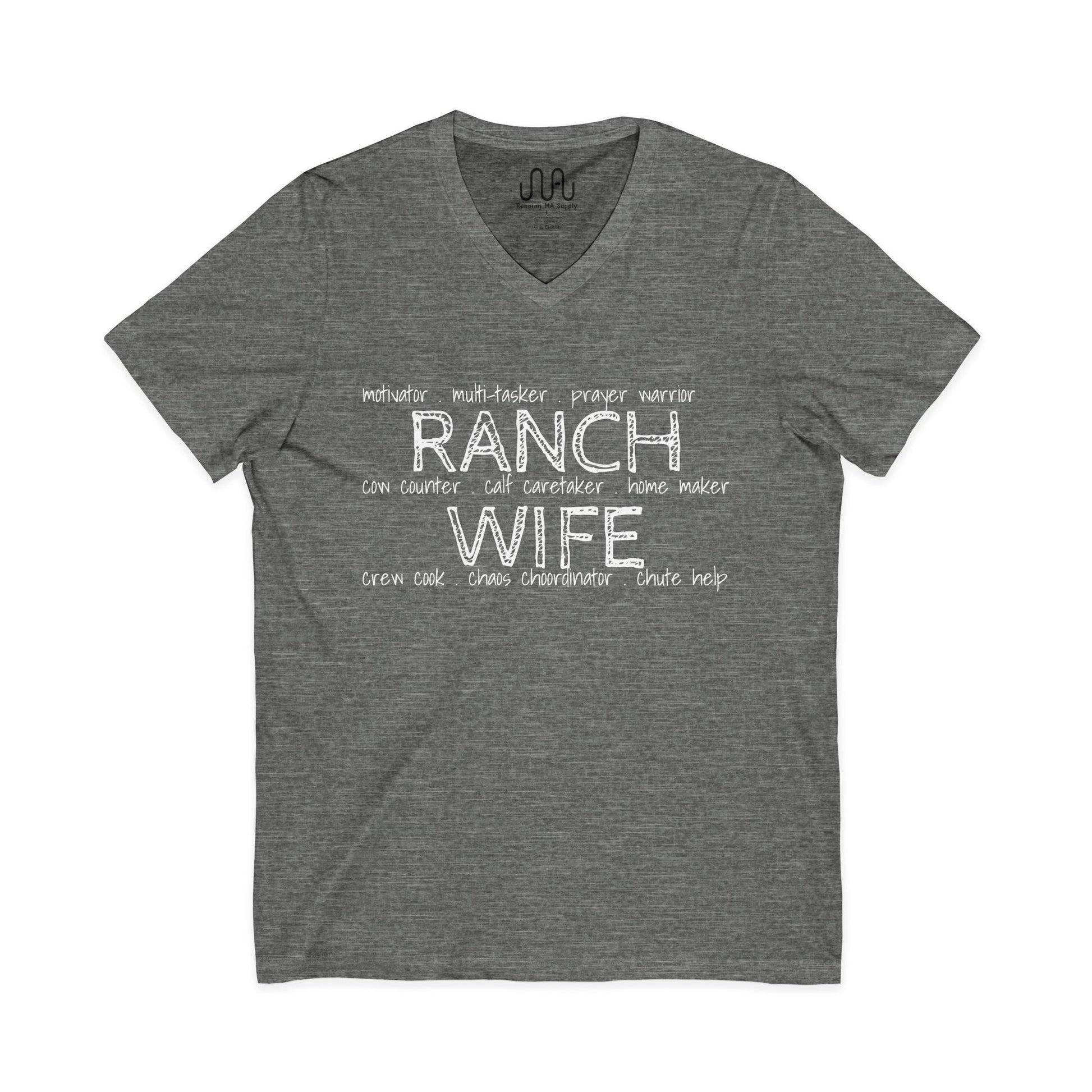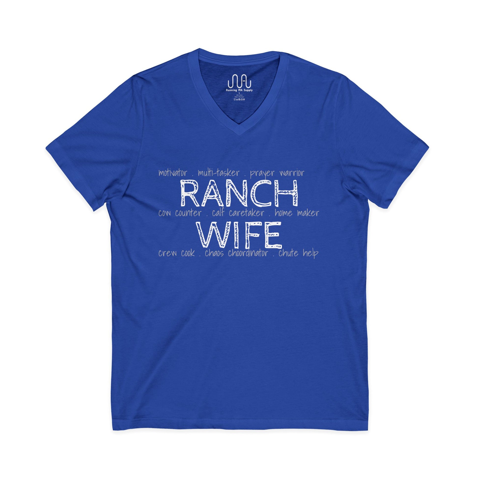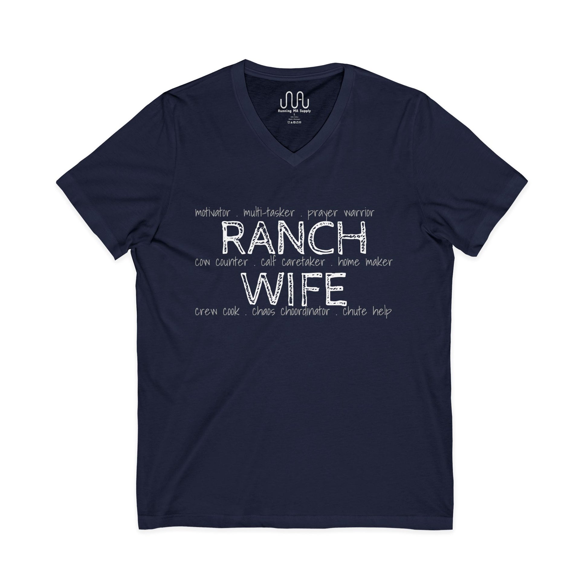 This western t-shirt is designed with working ranch wives in mind. Whether you stay home at the ranch or have a job in town, ranch wives have multiple job titles. This design features several of the most common duties.
